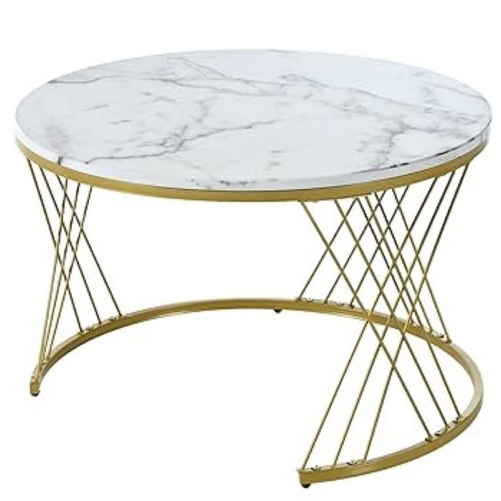It features a round tabletop with a white MDF Sheet in Marble Design-like pattern and a distinctive golden-colored metal base with a cage-like or spiraling design. Color : White & Golden ...