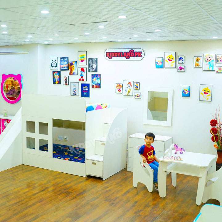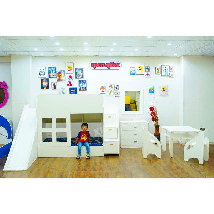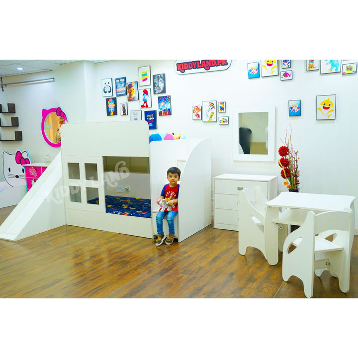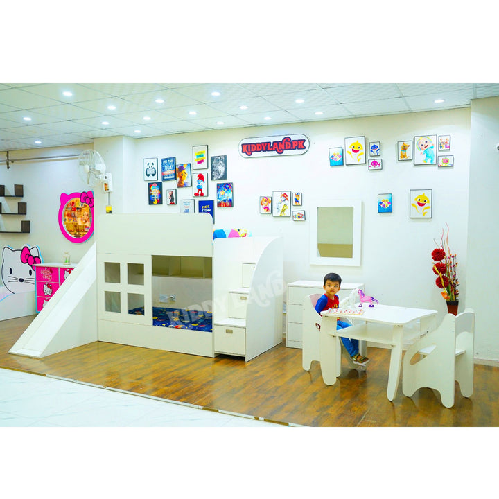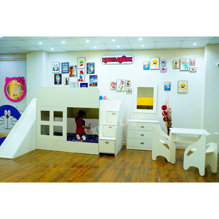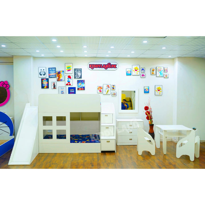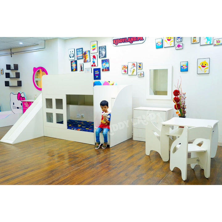 White Color Theme Room Set For Kids Material: Wooden Laminated Sheet Safety And High Quality Structure Quick And Easy Self Assembling Dimensions: Bed: Length 60 inches Width 36 inches (Without Mattress)...