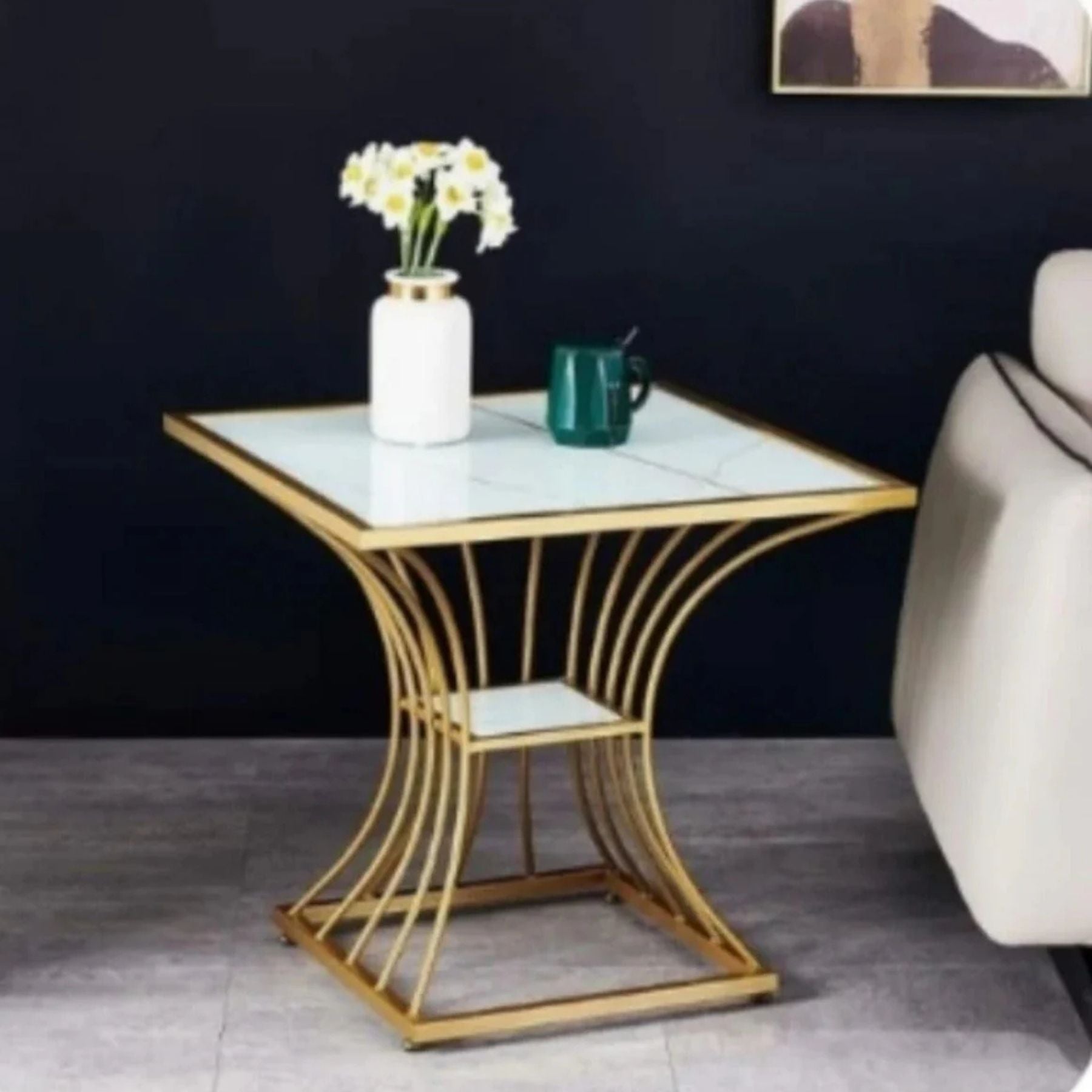 It features a distinctive, modern design with a square top and a unique, curved or sculpted gold metal base, possibly made of steel with a gold finish. Color : White &...
