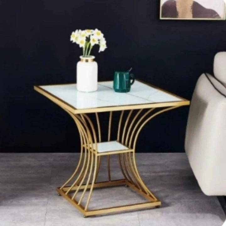 It features a distinctive, modern design with a square top and a unique, curved or sculpted gold metal base, possibly made of steel with a gold finish.